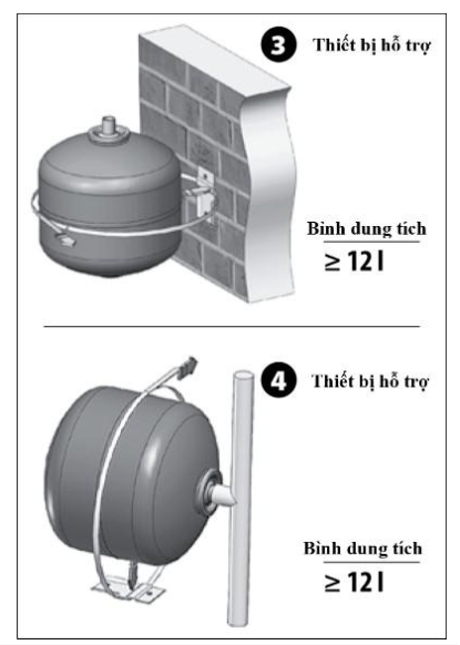• Nếu Bình áp lực có dung tích trên 12L được lắp, gắn lên trên, cần phải có một bộ phận đỡ thích hợp; nếu không có bộ phận hỗ trợ thì không được lắp (Hình 3 và Hình 4)
